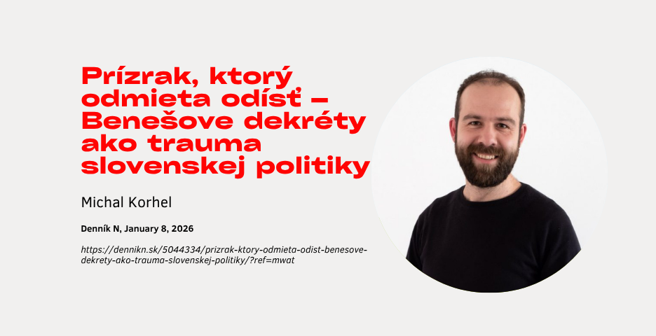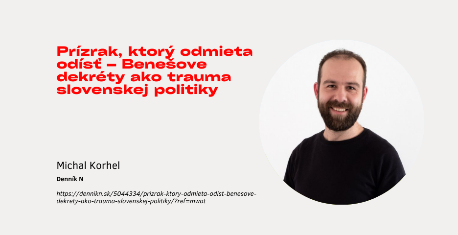 In his commentary, Michal analyzes the return of the Beneš Decrees to contemporary Slovak politics and law through the lens of hauntology. He argues that today the decrees function less as valid legal norms and more as a “specter” of the past that reappears in property disputes and political crises of identity. Although they are largely exhausted in legal terms, the Beneš Decrees remain symbolically powerful and are politically instrumentalized, particularly by the government, which presents them as an untouchable foundation of statehood. Michal also points to the difference between the Czech and Slovak contexts: while in the Czech Republic the decrees functioned mainly as a one-off political symbol, in Slovakia they return systematically and have tangible practical consequences. In conclusion, Michal emphasizes that instead of becoming a taboo, the “specter must be listened to” – that is, the historical and moral problematic nature of the decrees must be openly acknowledged and their legacy translated into the language of a twenty-first-century constitutional state, so that the past ceases to automatically determine the present.